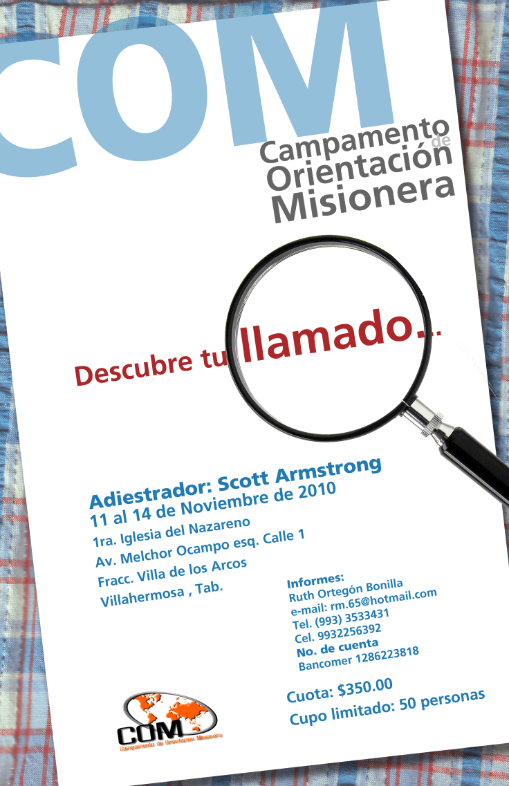 Gracias por averiguar y contactarme sobre este cambio en lugar del COM. Por las inundaciones y la inseguridad de las mismas carreteras, se decidió mover el COM del sitio en Villa Hermosa a Tapachula, Chiapas, siempre manteniendo las mismas fechas del 11 al 14 de noviembre. Yo mismo estoy cambiando mi boleto y los hermanos de Tapachula dicen que están inscribiendo a mucha gente en este momento. La idea es que regresaremos en 2011 (cuando no es tiempo de lluvia) a Tabasco para siempre realizar un COM. A la vez esperamos que vengas a Tapachula porque queremos conocerte y que recibas este buen entrenamiento misionero.