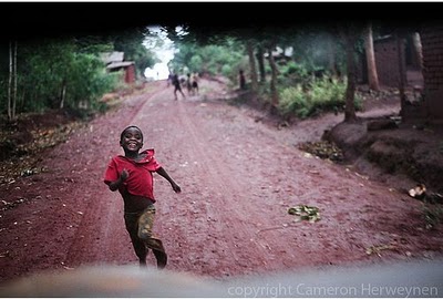 y luego corrió, sonriente al lado del coche,