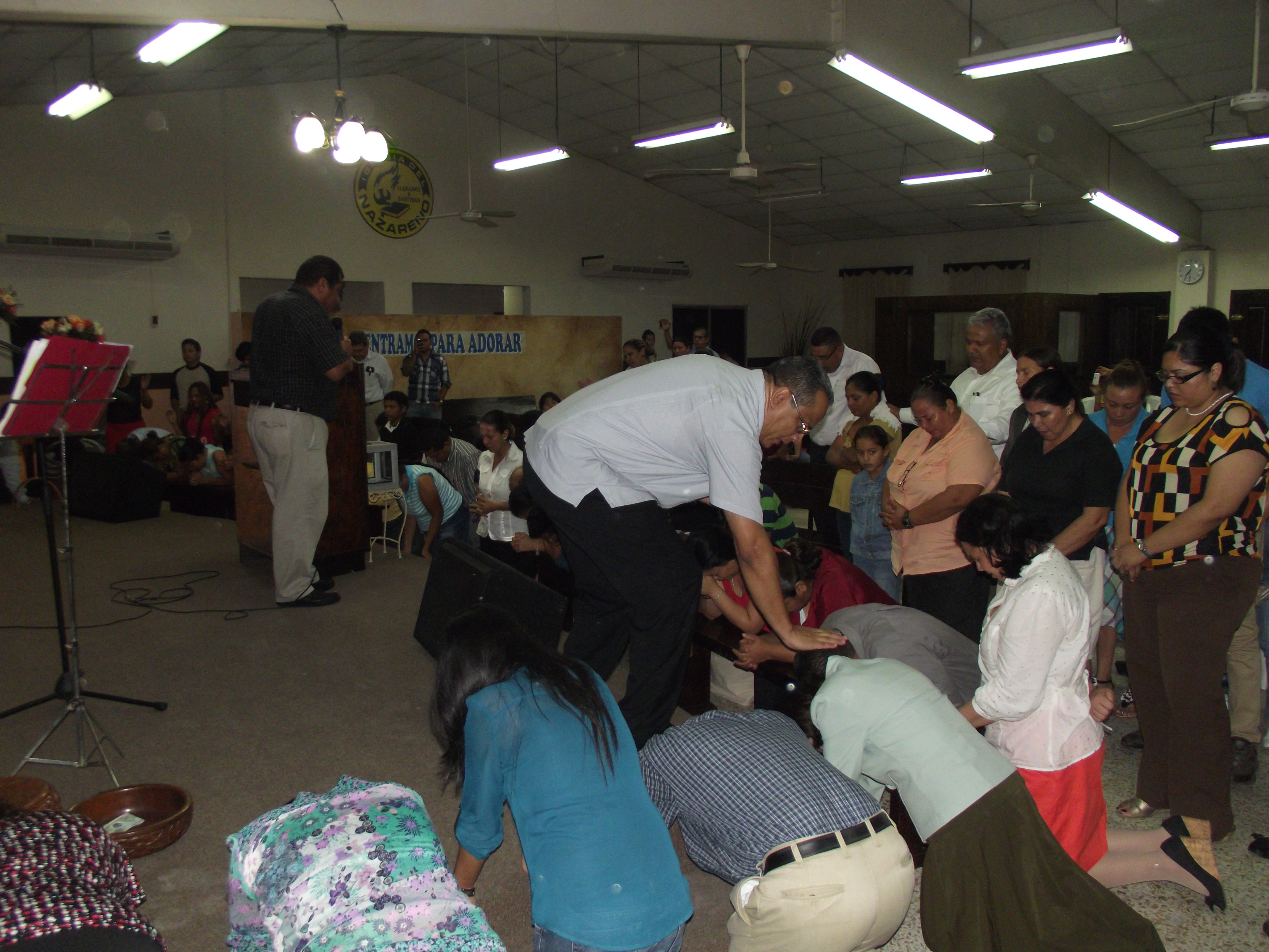 Dr. Carlos Saenz ora por los nazarenos que respondieron al llamado de Dios durante el servicio de entrega en San Pedro Sula, Honduras