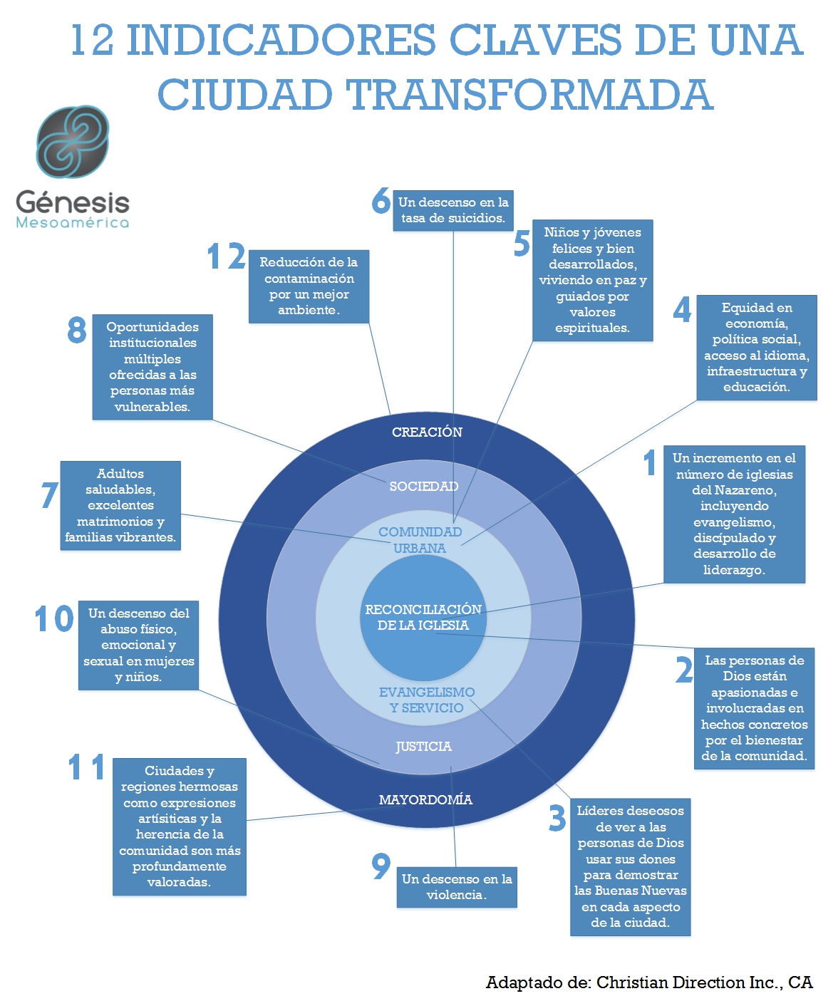 Queremos compartir con ustedes los 12 indicadores de una ciudad transformada, tal y como lo estamos visualizando en Génesis. Son estadísticas y/o situaciones que deseamos reducir o aumentar, conforme al poder transformador de Jesucristo, así sabras por dónde empezar a ORAR por esta gran iniciativa llamada: Génesis.