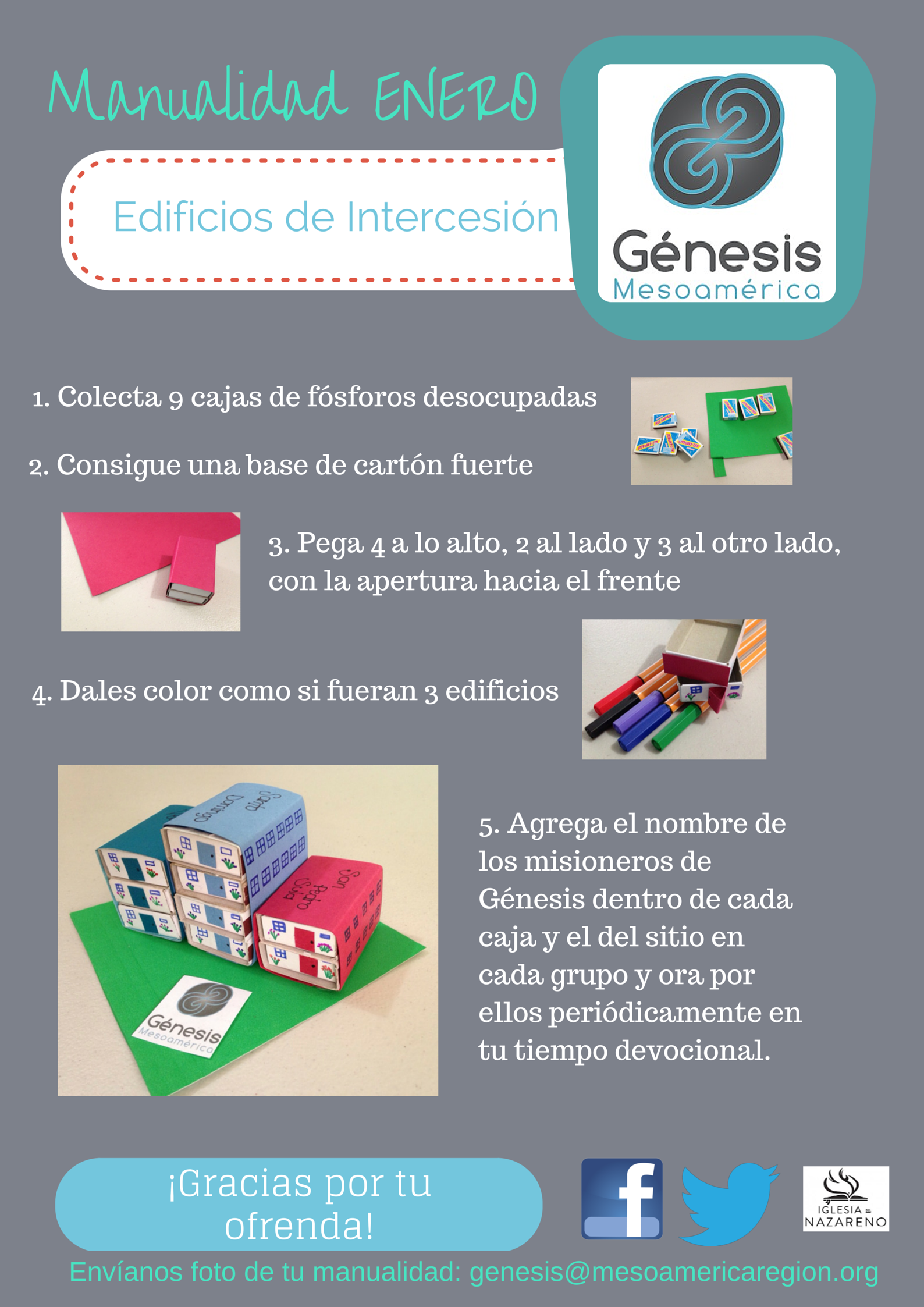 A continuación queremos compartir contigo el afiche promocional para la ofrenda de Enero de la MNI, destinada al ministerio regional Génesis. ¡Gracias por tu ofrenda! Además, más abajo puedes ver un afiche para hacer una manualidad con los niños y de esta forma mantener a los misioneros y a los sitios en oración.
