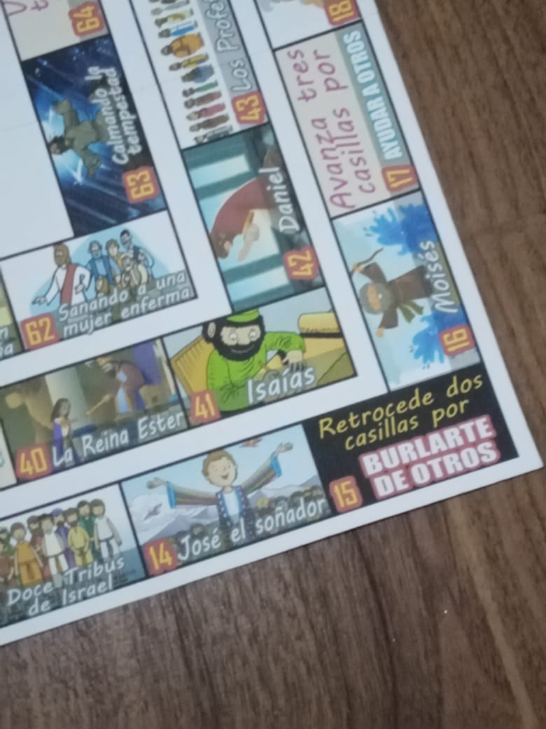 Una vez obtenida la idea general, dejamos la tarea de crear el juego a nuestro hermano licenciado en diseño gráfico, Marco Iván Portillo Noriega. Después de explorar muchas opciones o estilos para el juego, decidimos que cada casilla hiciera alusión a alguna de las historias bíblicas tanto del Antiguo y Nuevo Testamento, con el objetivo de crear curiosidad al jugador de conocer o saber de qué se trata cada historia bíblica. A su vez, se incluyeron casillas de premiación y de sanción en las cuales se hace referencia a que los buenos valores nos ayudan, pero los malos hábitos o valores nos perjudican. De esta manera, el juego busca fomentar valores morales en los niños y que así identifiquen que las malas acciones no nos llevan a algo agradable.